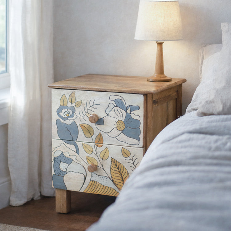 Introducing our handcrafted solid wooden bedside table, a stunning fusion of artistry and functionality. This exceptional piece features an attractive and modern abstract floral hand painting with intricate hand-carved outlines, creating a captivating blend of style and design. The abstract floral hand painting showcases a harmonious color palette of grey, yellow, and brown, perfectly blending with the body of the product. The carefully chosen colors bring a sense of warmth and vibrancy to the table, while the abstract floral design adds a touch of uniqueness and sophistication. Crafted from premium solid wood, the bedside table boasts a beautiful combination of a bleached white and teak finish, providing an elegant and timeless look. The contrast between the natural wooden finish and the intricate carving highlights the attention to detail and creates a visually striking statement. Functionality meets style with this bedside table. The spacious tabletop offers ample surface area for your bedside essentials, such as a lamp, alarm clock, or books. The drawer and open shelf provide convenient storage for personal items, keeping your space organized and clutter-free. Each detail of this handcrafted bedside table has been meticulously executed, from the precision of the hand painting to the smooth finish. The abstract floral design with hand-carved outlines adds a touch of artistry and showcases the skill and talent of our craftsmen. Elevate your bedroom decor with the beauty and craftsmanship of this handcrafted solid wooden bedside table. Let it become a centerpiece of style and sophistication, adding a unique charm to your sleeping space. Embrace the harmonious blend of colors in the abstract floral hand painting and the natural wooden finish, creating a captivating visual impact that is sure to impress. Experience the perfect fusion of art and functionality with this handcrafted bedside table. Invest in a piece that not only showcases exceptional craftsmanship but also adds a touch of elegance and individuality to your bedroom. Immerse yourself in the intricate details of the abstract floral hand painting and enjoy the beauty and functionality this bedside table brings to your sleeping sanctuary.